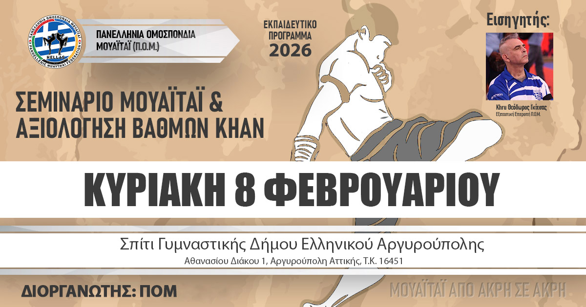 Σύμφωνα με το Εκπαιδευτικό Πρόγραμμα της Πανελλήνιας Ομοσπονδίας Μουάιτάι (ΠΟΜ), στα πλαίσια ενημέρωσης και κατάρτισης αθλητών και προπονητών, θα πραγματοποιηθεί Σεμινάριο Αγωνιστικού & Παραδοσιακού Μουάιτάι, καθώς και Αξιολόγηση Βαθμών (Khan), την Κυριακή 8 Φεβρουαρίου 2026 και ώρα 11:00 – 19:00, στο “Σπίτι της Γυμναστικής” (Αθανασίου Διάκου 1, Αργυρούπολη Αττικής, Τ.Κ. 16451). Δείτε την τοποθεσία εδώ.