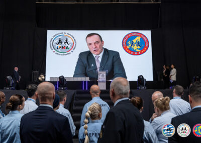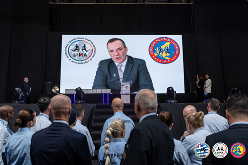 Ο Πρόεδρος της Π.Ο.Μ., κ. Ιωάννης Παπαδόπουλος, ο οποίος είναι και Αντιπρόεδρος της Ευρωπαϊκής Ομοσπονδίας, καθώς και Ταμίας της Παγκόσμιας Ομοσπονδίας IFMA, ανέβηκε στο βήμα, εκφράζοντας την υπερηφάνεια της Πανελλήνιας Ομοσπονδίας Μουάιτάι για τη διεξαγωγή μιας ακόμη, υψηλού επιπέδου διοργάνωσης και ευχαριστώντας όλες τις εθνικές αποστολές που συμμετέχουν.